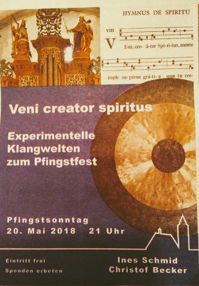 Marienstiftskantor Christof Becker und Susanne Ines Schmid werden einen einzigartigen Klangteppich weben, bestehend aus Orgel, Cembalo, Gongs, Klangschalen, Kristallpentonia, Phasedrum, Aureliophone, Doppelflöte und anderen Klanginstrumenten. Es werden Werke von Bach, Grigny, Durufle und Improvisationen zu hören sein. Das Motto lautet „Veni Creator Spiritus“.
